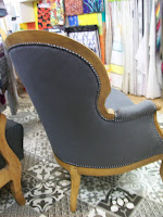 Canapé style Louis-Philippe, relooker zen, par le bois clair, et son tissu neutre dans sa teinte gris souris, la finition clous colorie plomb